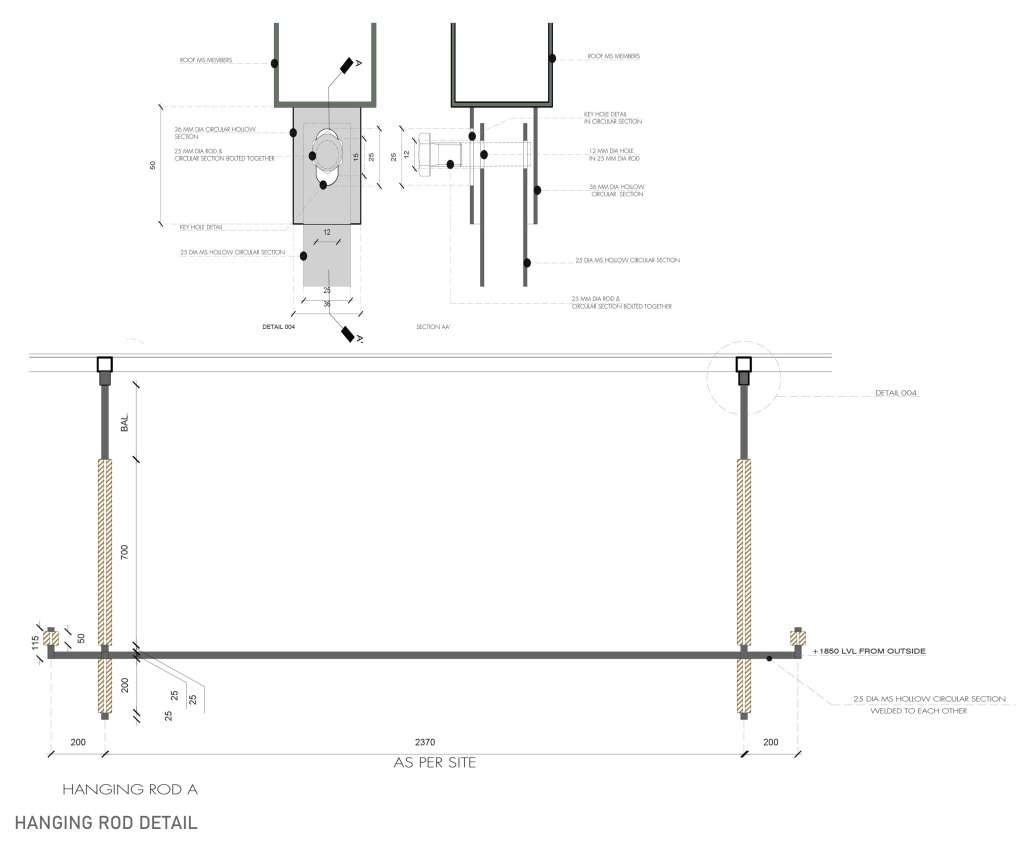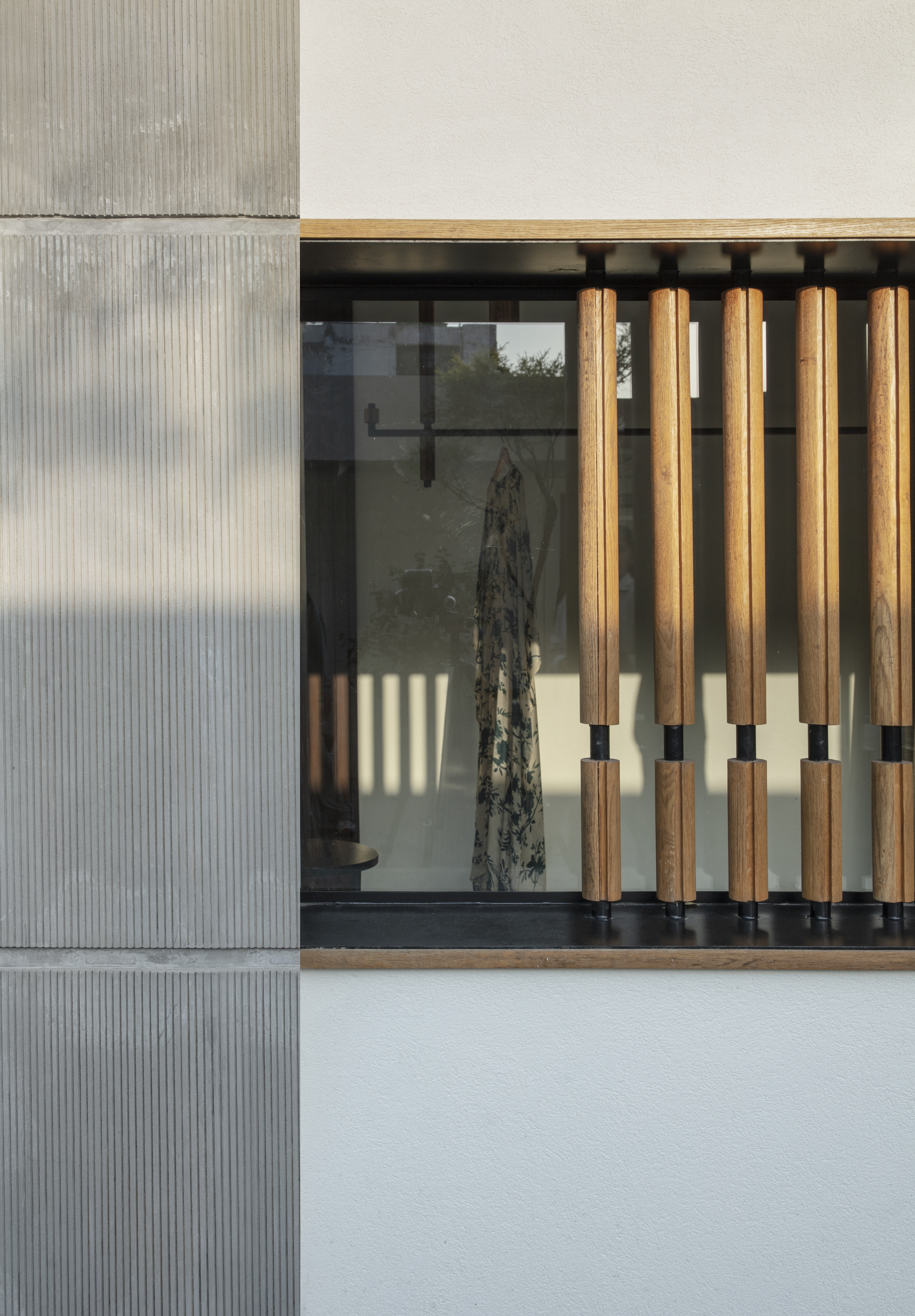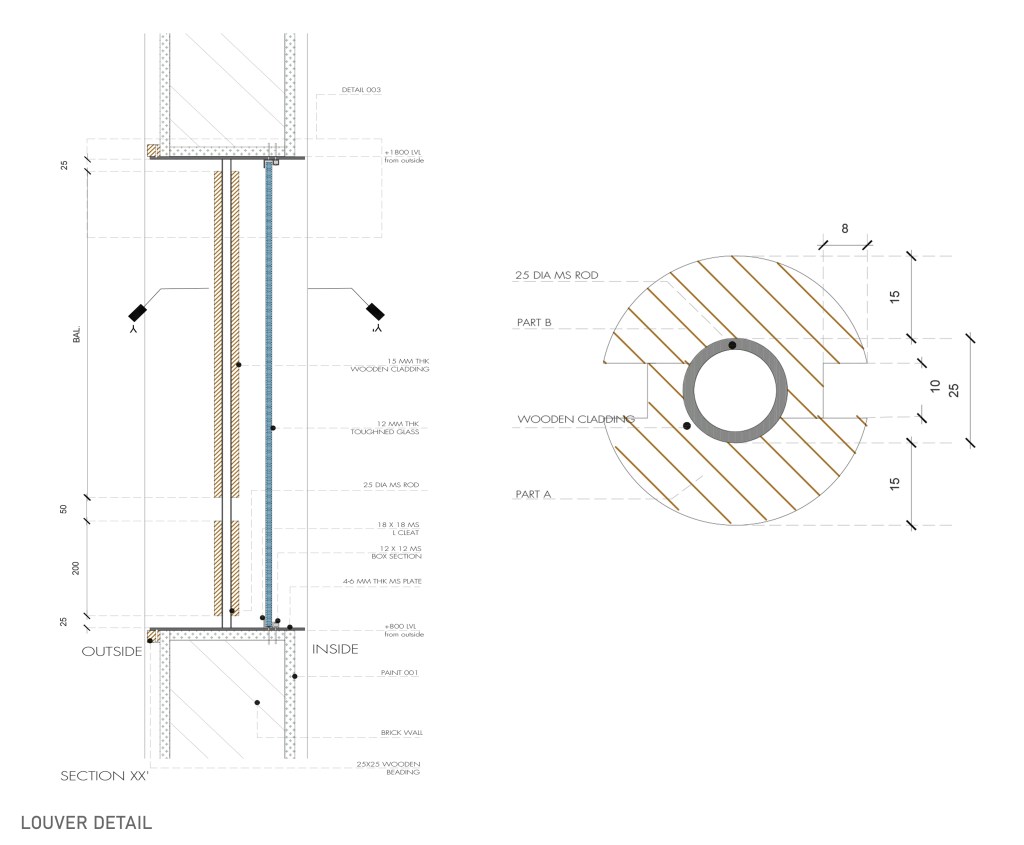 The façade presents itself as a stark white volume sculpted by its voids, harmoniously nestled beneath the shade of a Neem tree. The ‘Ribbon Window’ which extends and wraps around the corner, liberates one from the preconceived sense of a structure, in hopes of not being perceived as ‘Fascist’ and potentially getting ‘Cancelled’. Walking through the chiseled stone entryway, the user is introduced to an island unit bathed in sunlight. The louver detail was intricately crafted to conceal as well as soften the structural components. The natural light filtering through an array of wooden posts caresses the interior space, meticulously choreographed to offer a soothing yet tactile experience.