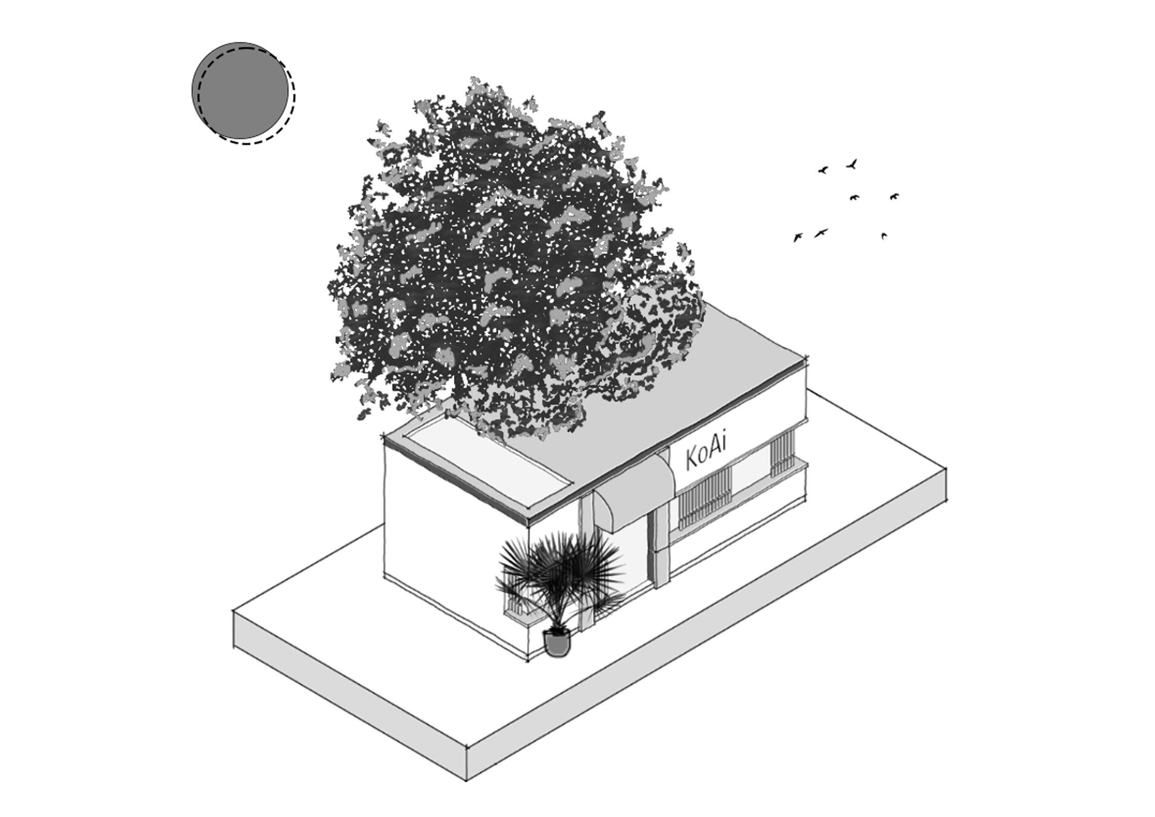 The façade presents itself as a stark white volume sculpted by its voids, harmoniously nestled beneath the shade of a Neem tree. The ‘Ribbon Window’ which extends and wraps around the corner, liberates one from the preconceived sense of a structure, in hopes of not being perceived as ‘Fascist’ and potentially getting ‘Cancelled’. Walking through the chiseled stone entryway, the user is introduced to an island unit bathed in sunlight. The louver detail was intricately crafted to conceal as well as soften the structural components. The natural light filtering through an array of wooden posts caresses the interior space, meticulously choreographed to offer a soothing yet tactile experience.