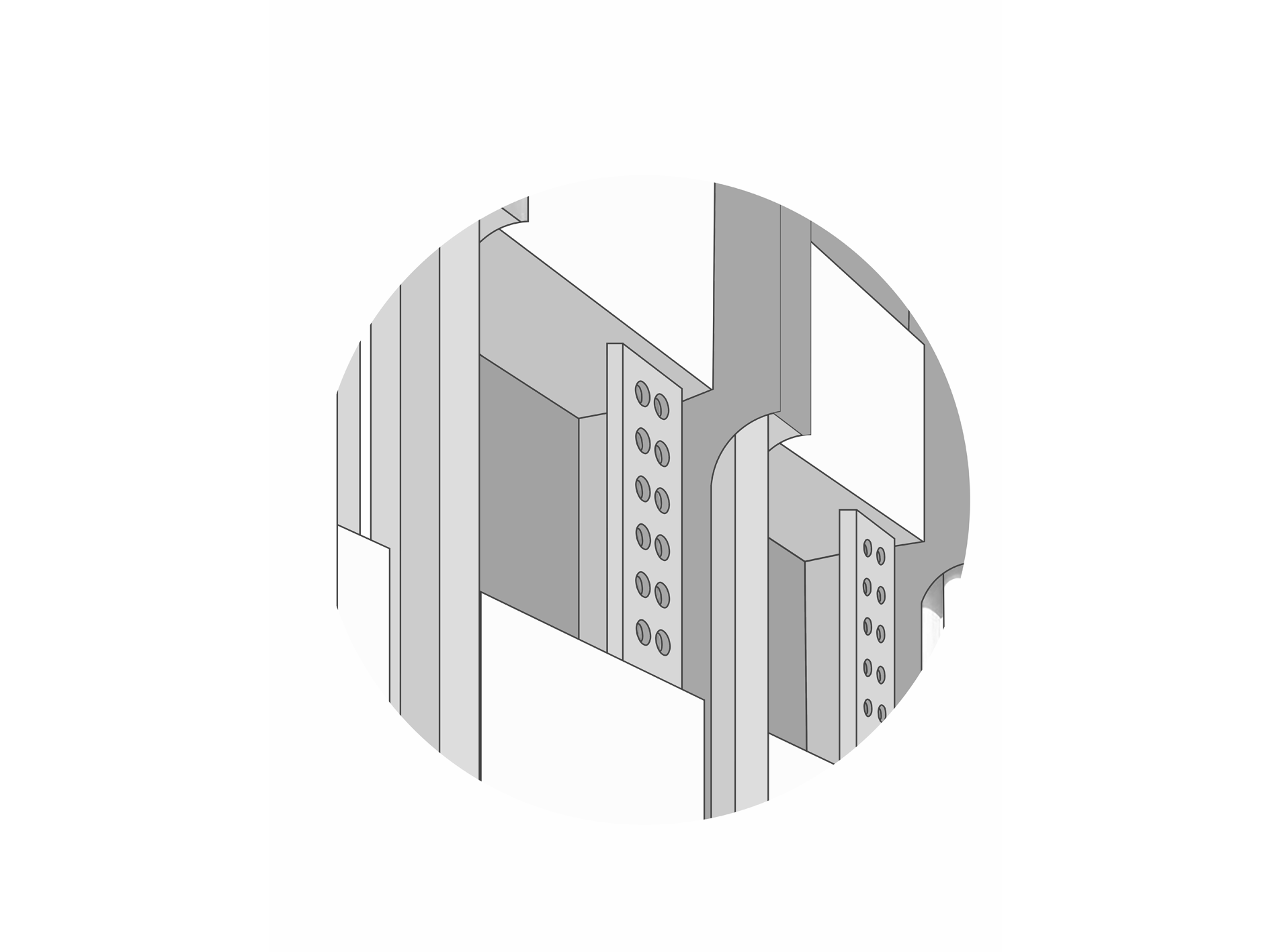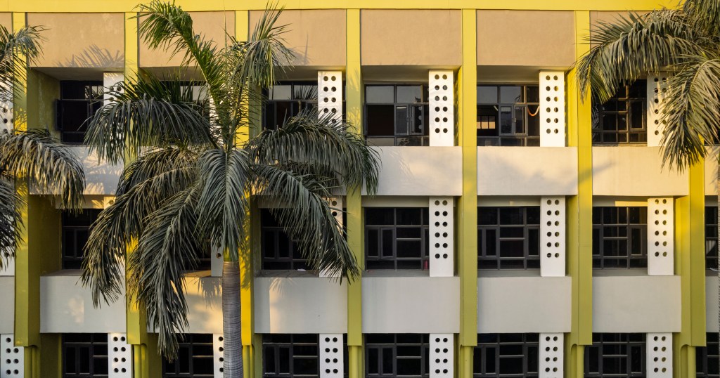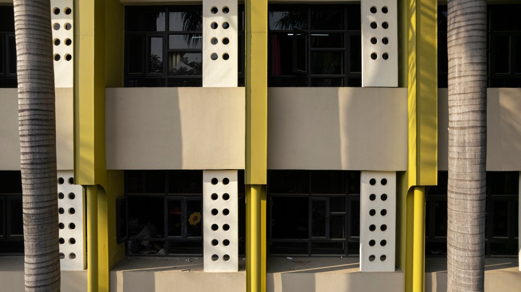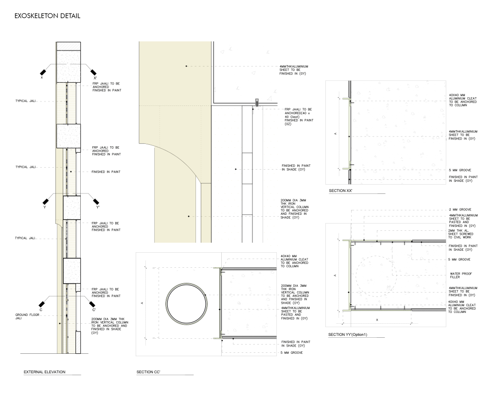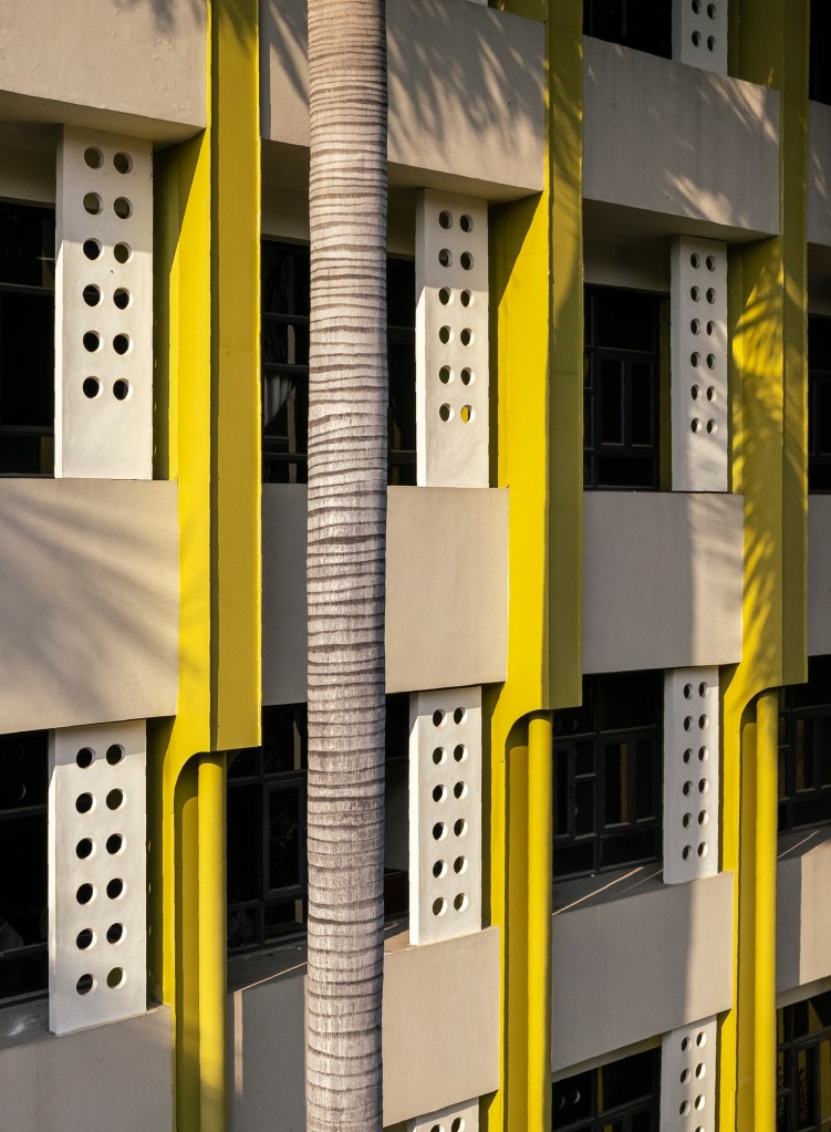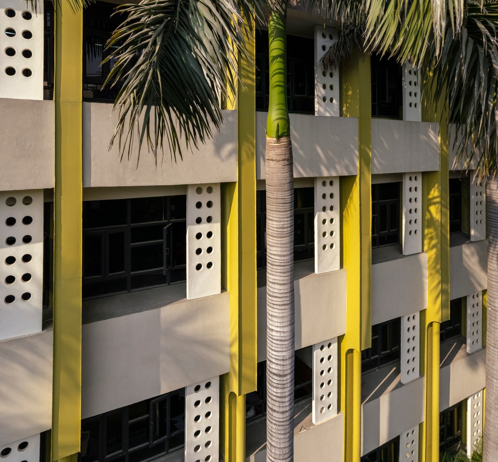 Coupled with the steel sections are a set of repeating jaalis across the façade adorned by large circular punctures, intended to extend the playful character and punctuate the symmetrical windows. The juxtaposition of the horizontal and vertical treatments intersects with the gigantic Royal Palm trees, resulting in the volumes being read along their axes, as one glances from afar.