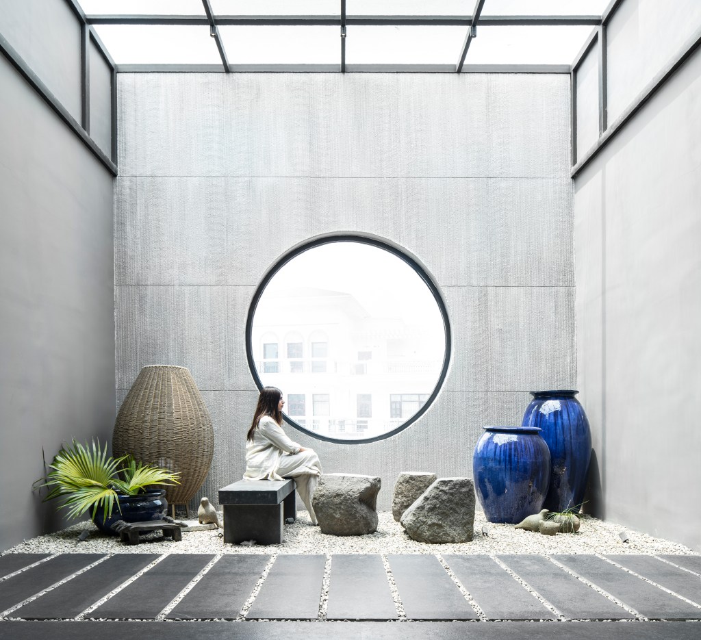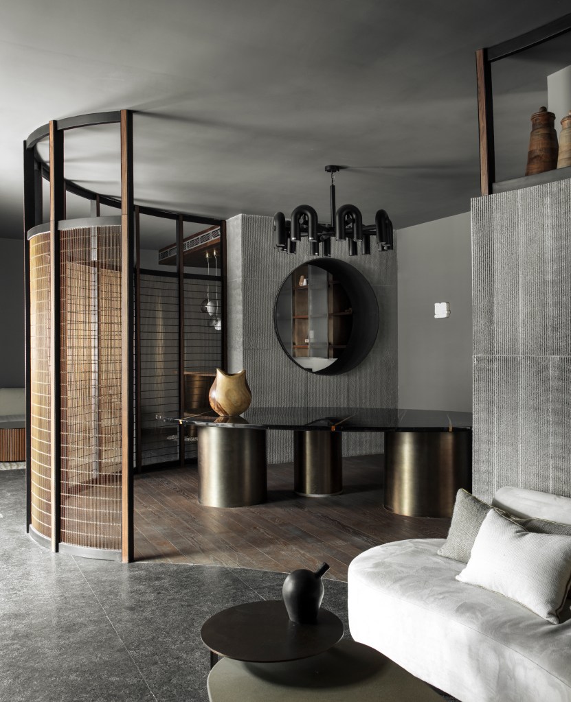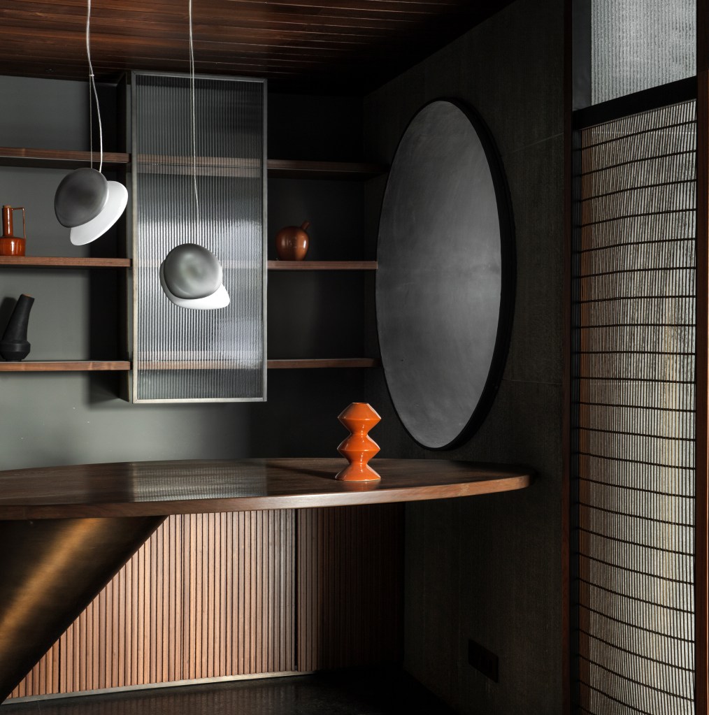 The Bar table emerges from a patch of gravel, meticulously crafting a mise-en-scene that rouses the senses and offers room for introspection as one pours a drink. The back unit provides a functional yet modest display, adorned with playful elements, optionally hidden by fluted-glass sliding shutters. A small lounge space designed using slender metal details and Danish weave loungers sits at the access to the bar. A gigantic circular opening punctuates the wall towards the dining, where one can peek through, communicate and even serve.