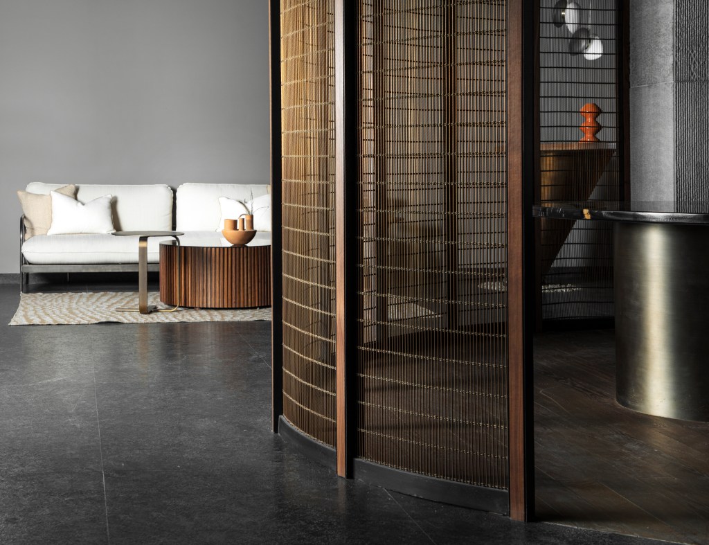 The flooring plays a vital role in creating layers of perceived division inside the unencumbered space. The rough grain textures of the Indian Basalt Stone flooring meets and contrasts the Wooden flooring, flowing into the dining space from the terrace. A delicate and tactile screen, made using a woven metal mesh and wooden inlays, runs across a curvature, diffusing the junction while layering the volumes. Within the curvature lies a dine-in, furnished with black marble and brass accents, crafting a space that feels intimate, yet in abundance.