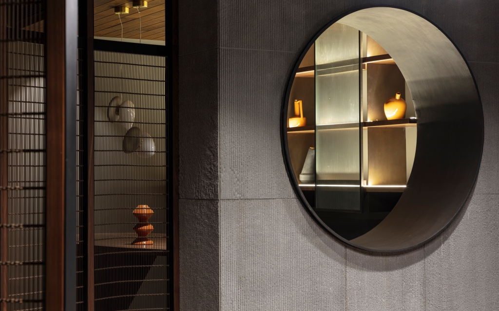 Seamlessly woven into each other are the three realms that define the entertainment area; The first being a serene gaming lounge – a sit-out space enriched by the raw finish of grey chiseled stone cladded upon the walls as a backdrop, delicately complemented by the warmth of brass accents and dapples of sunlight that lend itself to the space.